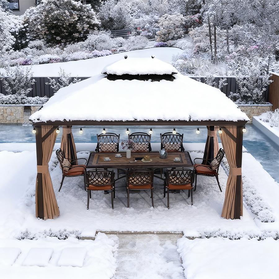 【Stark widerstandsfähig】:Das farbechte und rostbeständige verzinkte Stahldach hält helles Licht und schädliche UV-Strahlen ab und macht dieses Hardtop-Pavillon stark genug, um schweren Schnee zu tragen.