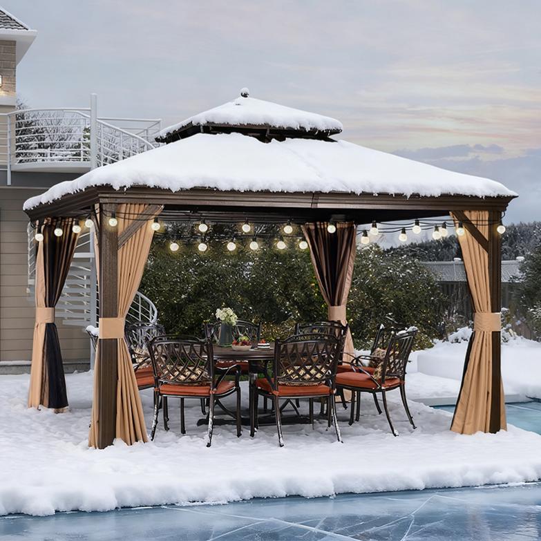 【Doppeltes Dachdesign】:Angemessen geneigtes Dach, um Wasser schnell abfließen zu lassen, und das Wasserrinnendesign dieses Hardtop-Pavillons sorgt dafür, dass Regenwasser an den Rändern des Rahmens und der Pfosten abfließt.