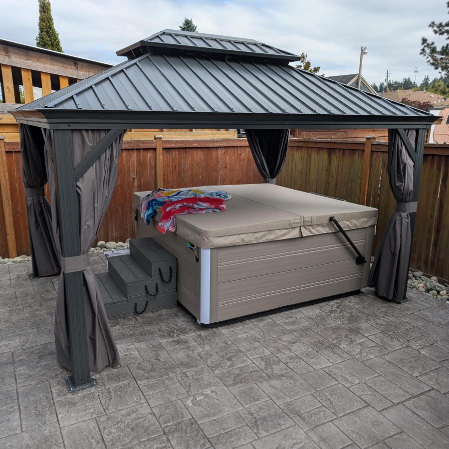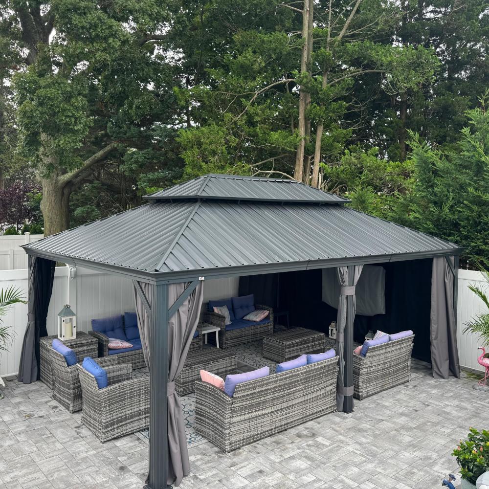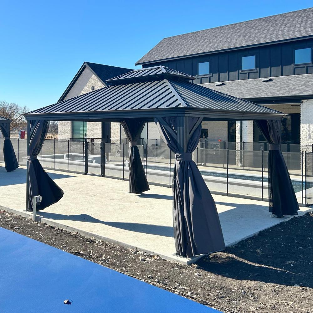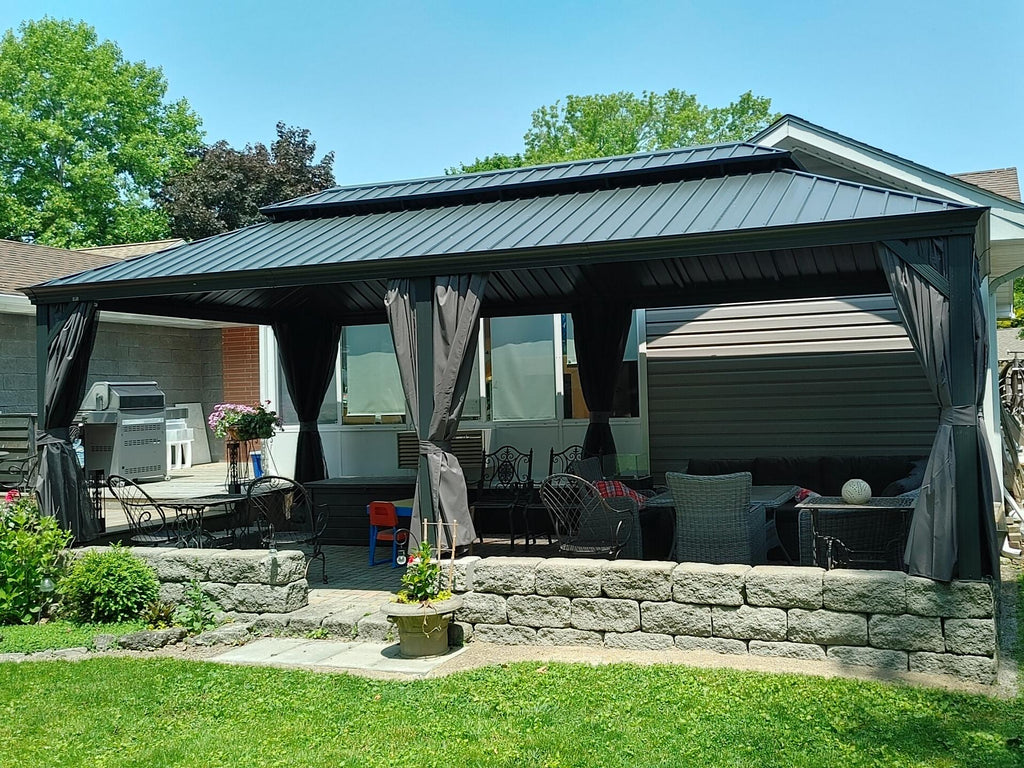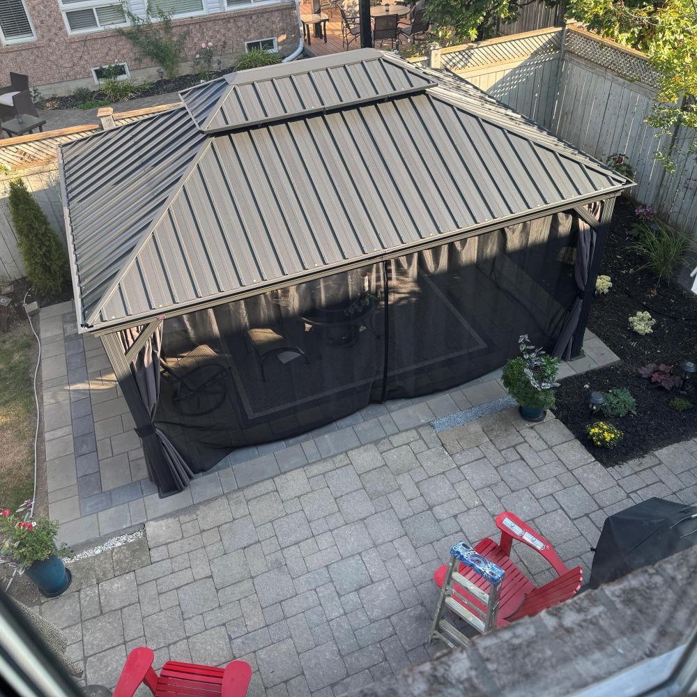 - [ Bitte beachten ❗ ]: Das Pavillon sollte nach der Montage fest im Boden verankert werden. Bitte prüfen Sie vor dem Kauf lokale Bauvorschriften und HOA-Richtlinien, da eine Genehmigung erforderlich sein kann.