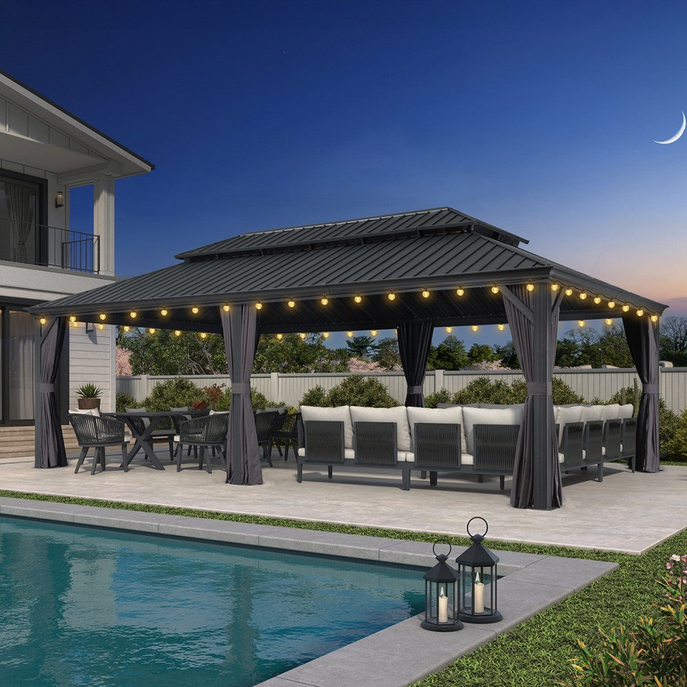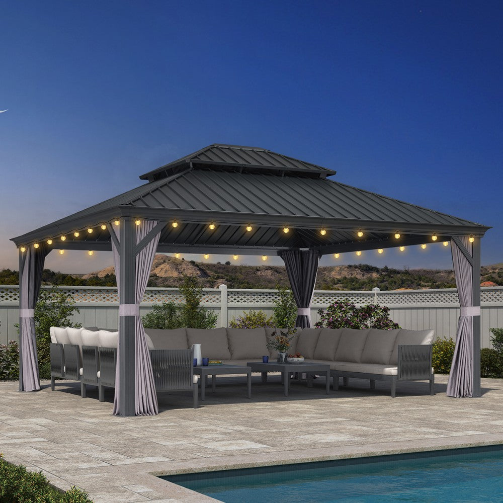 Material Dunkelgrauer pulverbeschichteter Aluminiumrahmen, verzinktes Hardtop-Dach, hellgraue Vorhänge und Moskitonetze, transparente Lichterketten