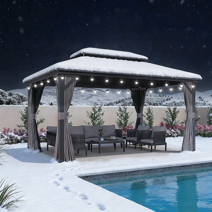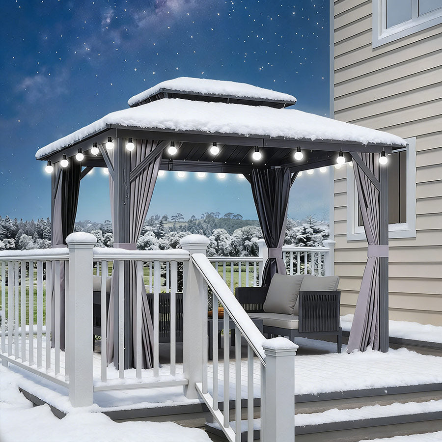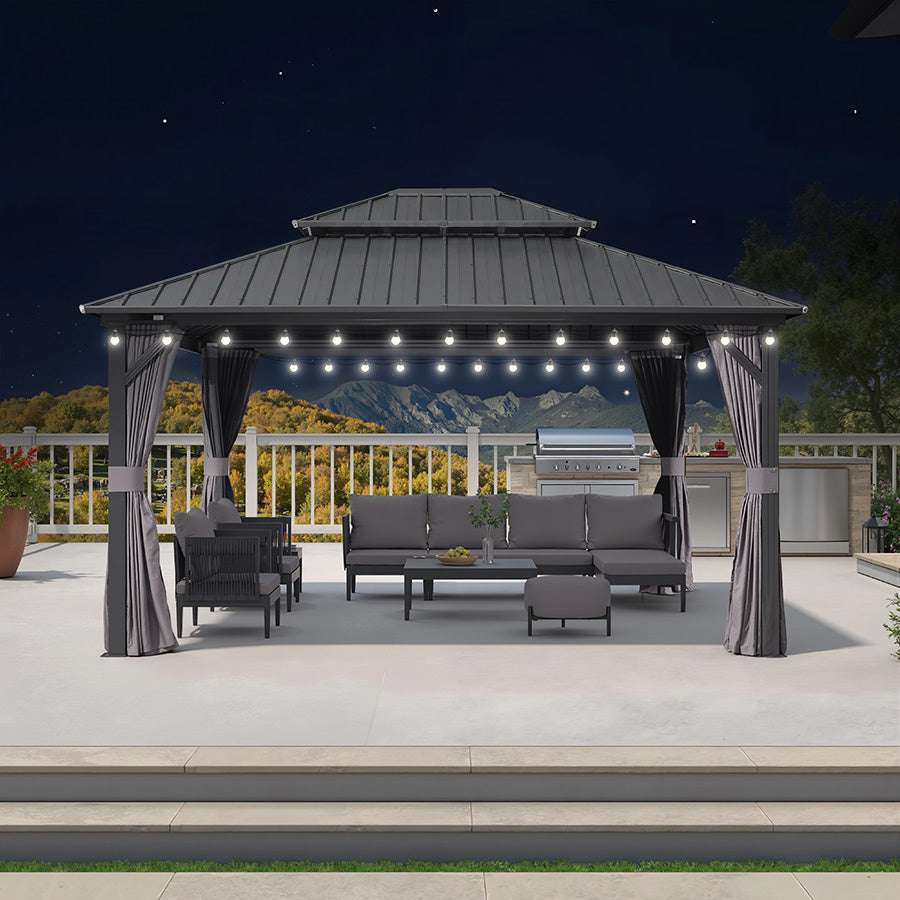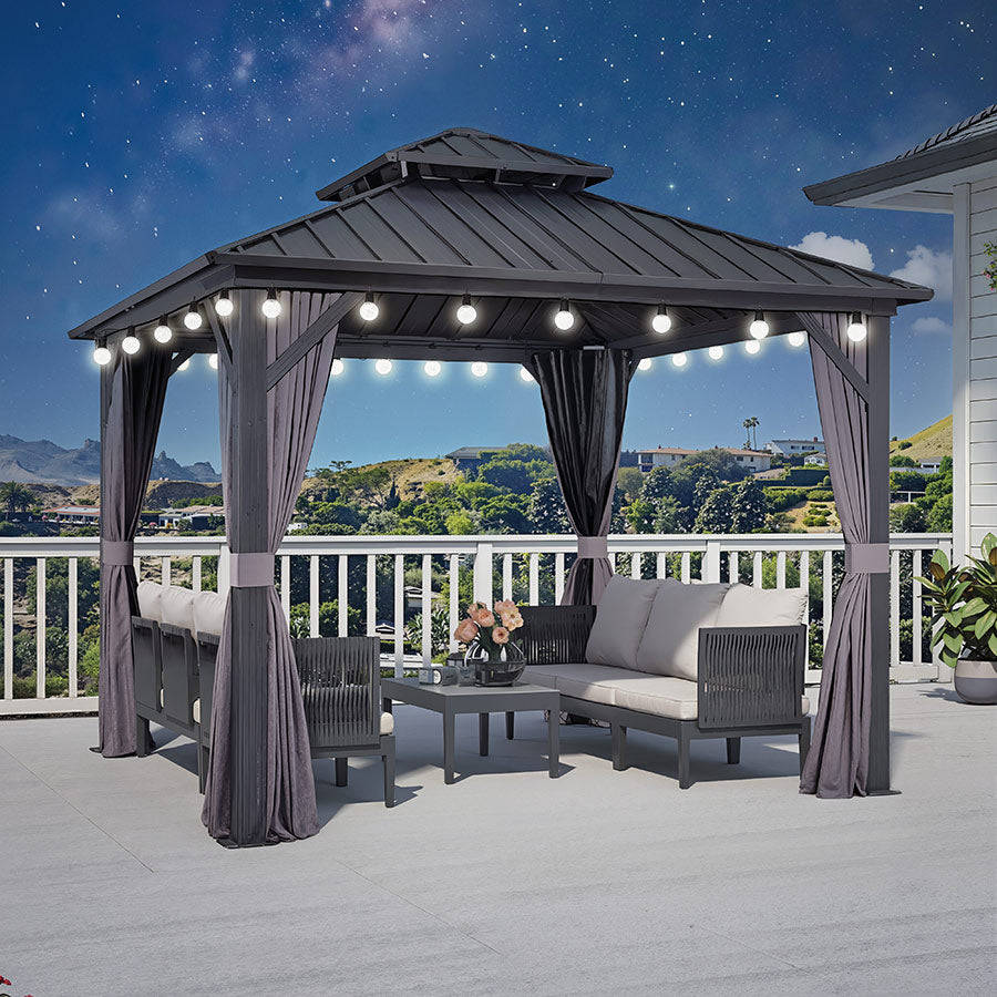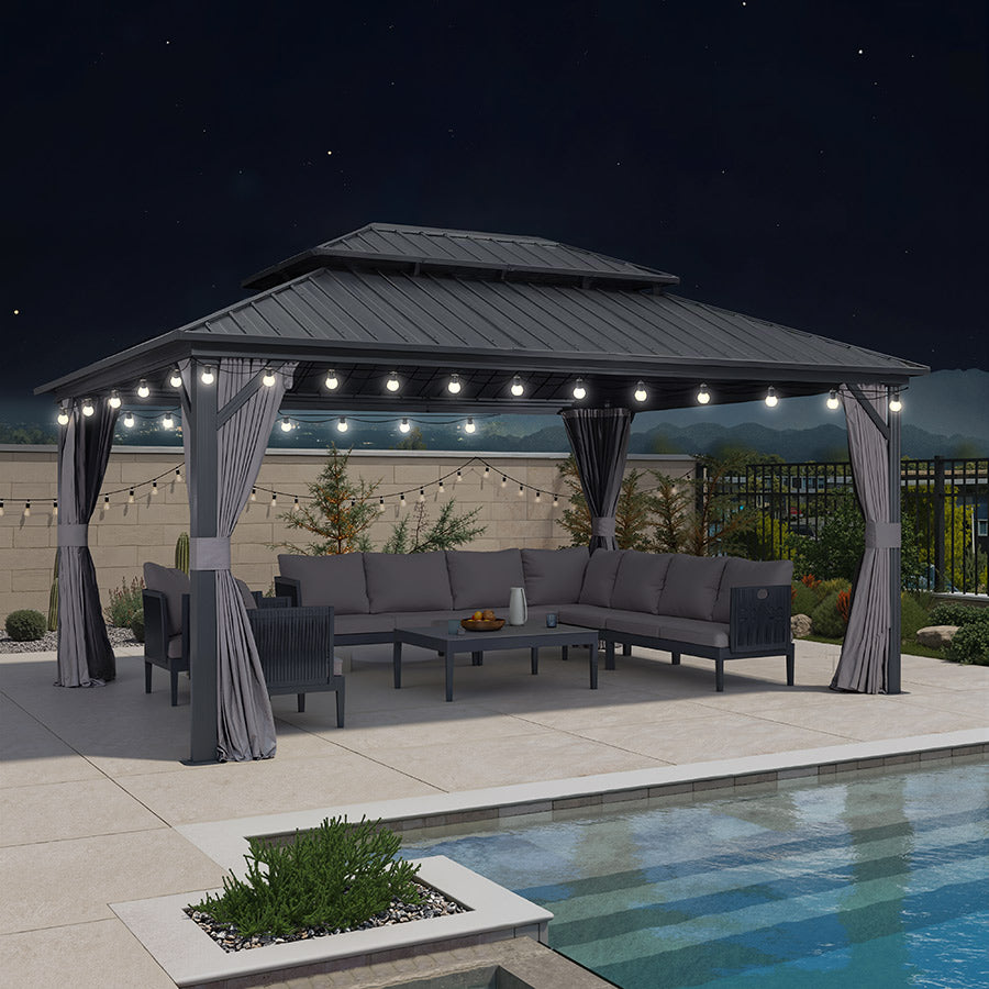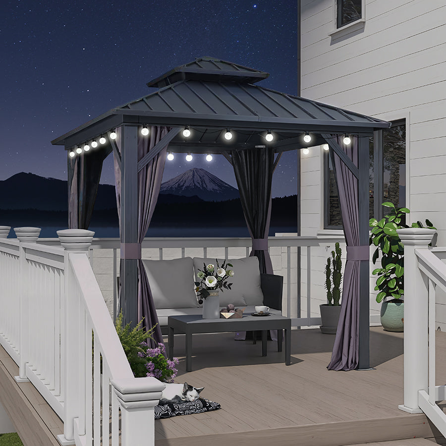 Material Dunkelgrauer pulverbeschichteter Aluminiumrahmen, verzinktes Hardtop-Dach, hellgraue Vorhänge und Moskitonetze, milchweiße Lichterketten