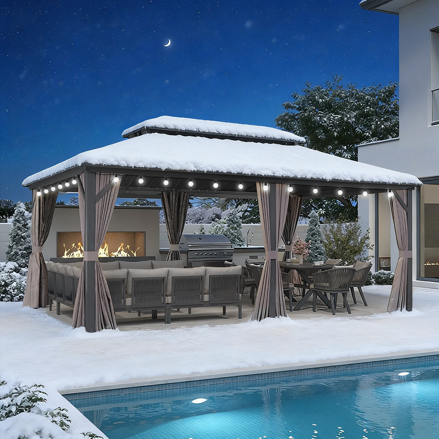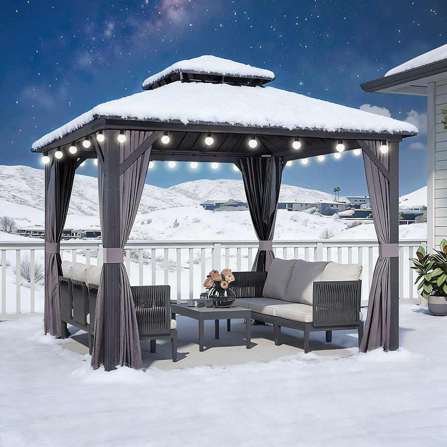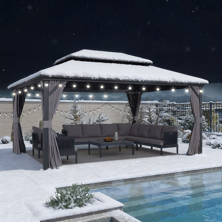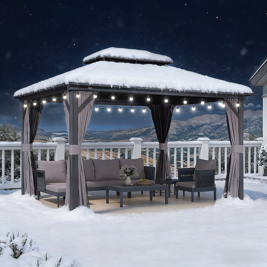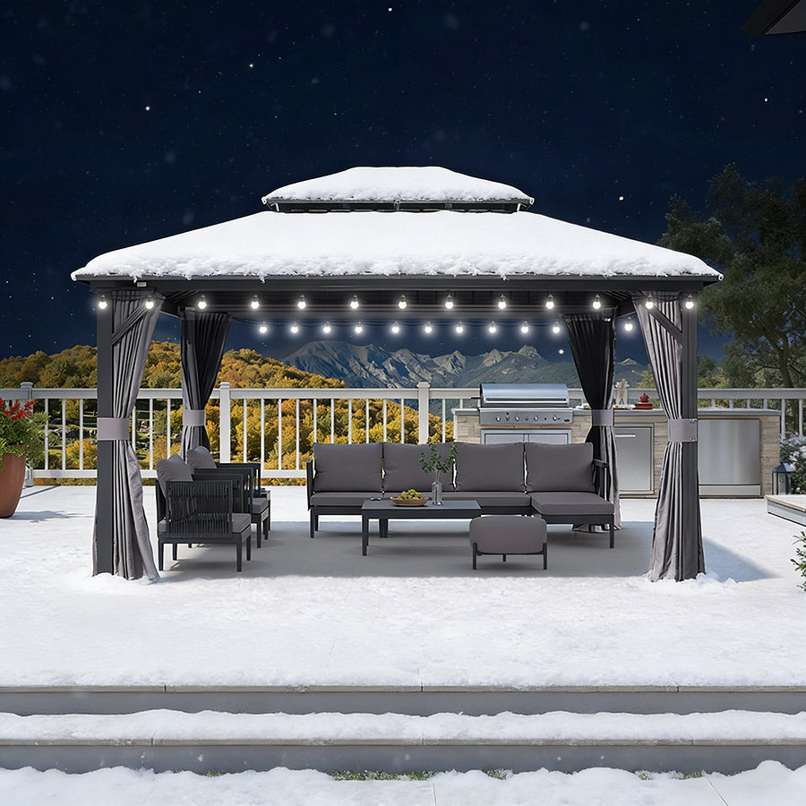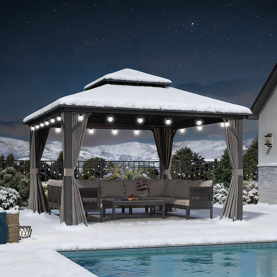 PURPLE LEAF Grauer Hardtop Pavillon mit robustem Doppeldach aus verzinktem Stahl und milchweißen Lichterketten