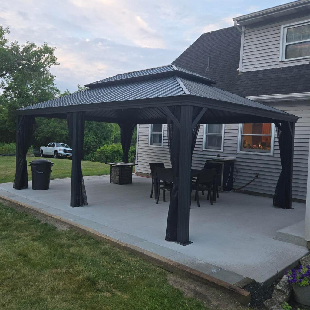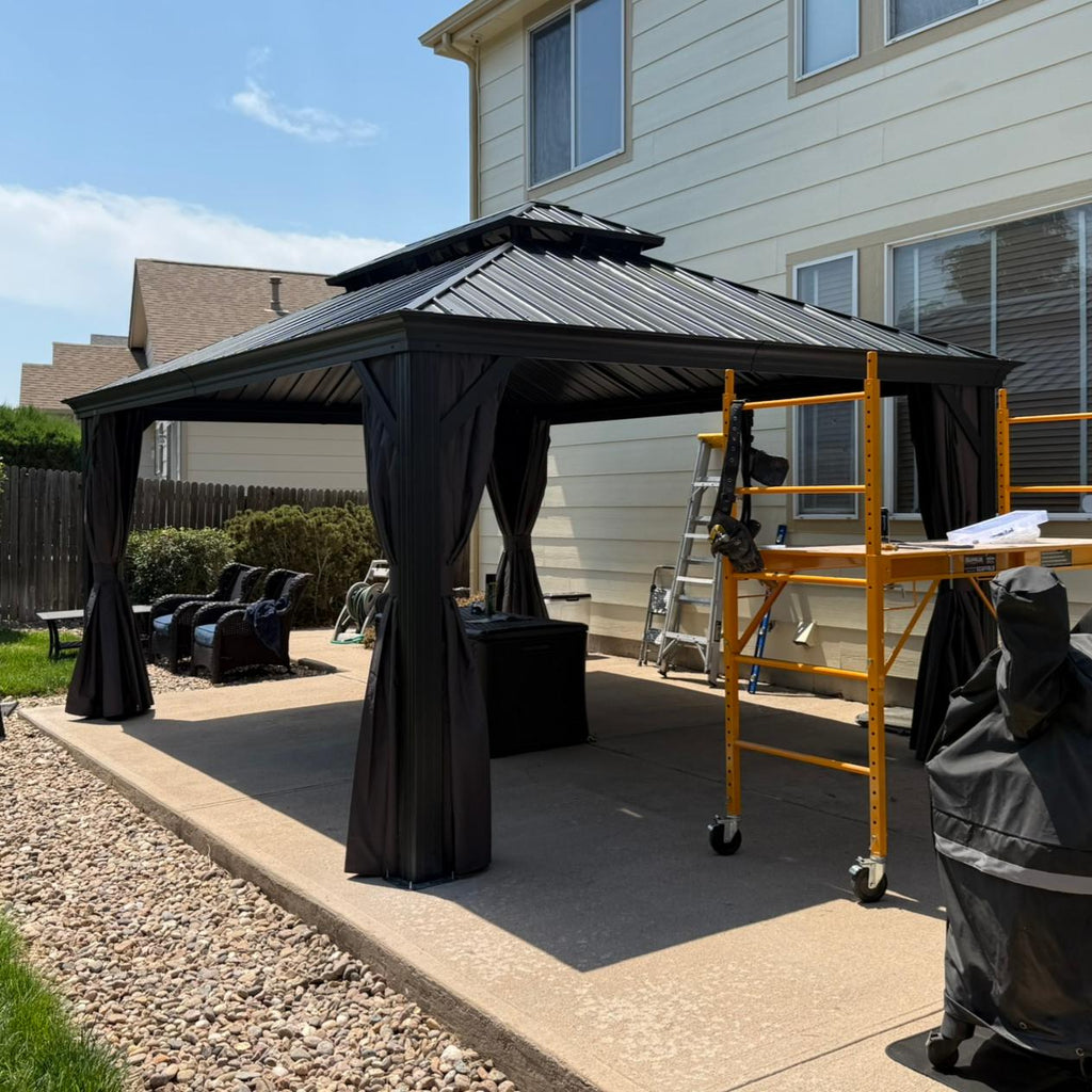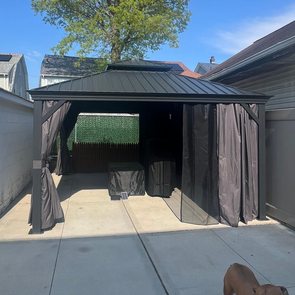 - [ Bitte beachten ❗ ]: Das Pavillon sollte nach der Montage fest im Boden verankert werden. Bitte prüfen Sie vor dem Kauf lokale Bauvorschriften und HOA-Richtlinien, da eine Genehmigung erforderlich sein kann.