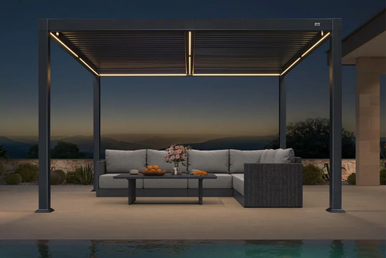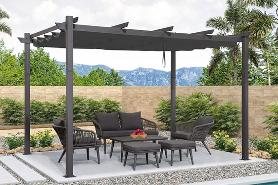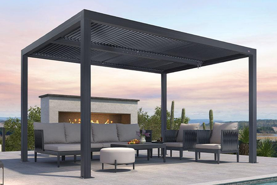 - Rostbeständigkeit: Es werden zwei Arten von Pergolen angeboten, eine Pergola mit Lamellen und eine versenkbare Pergola. Ihre dauerhaften Rahmen sind aus Aluminium, die feuchtigkeitsbeständig, rostbeständig und strukturell stabil sind.