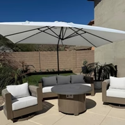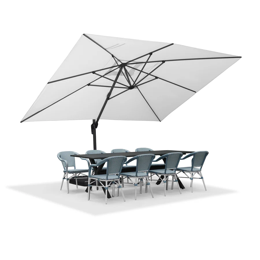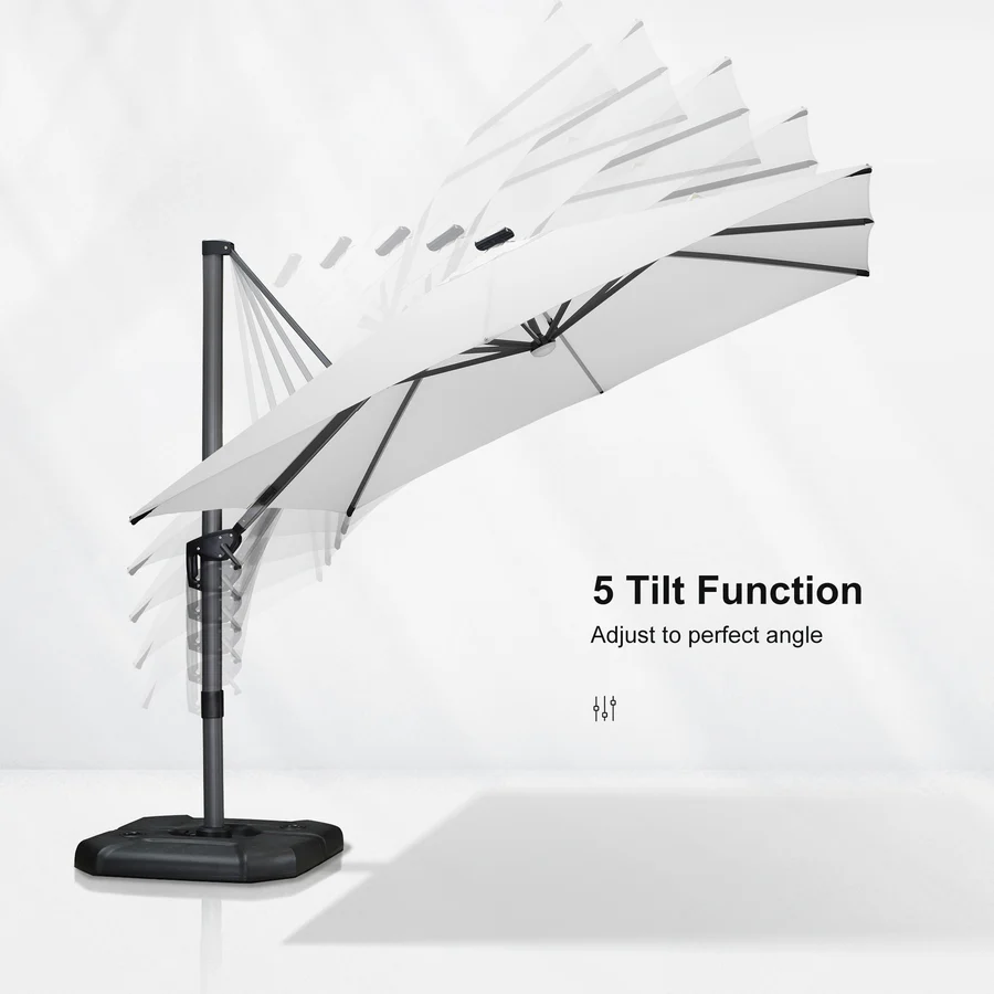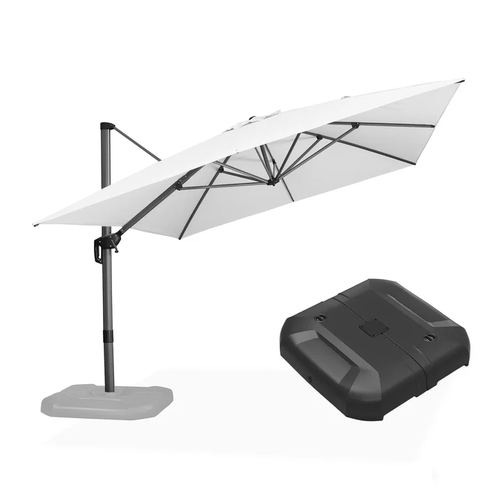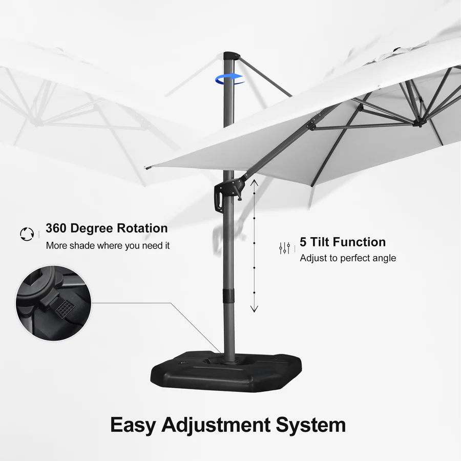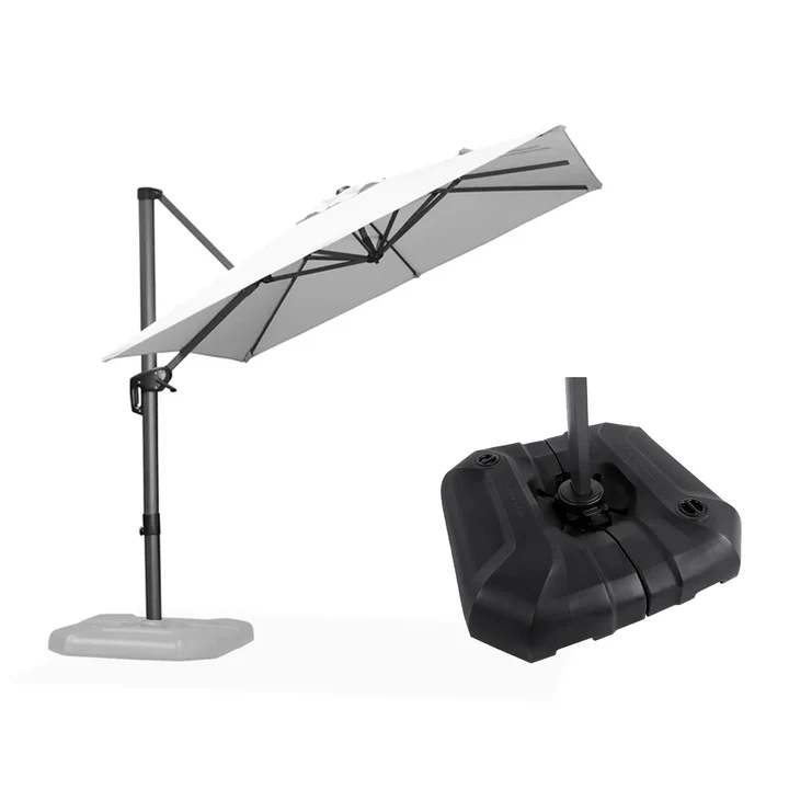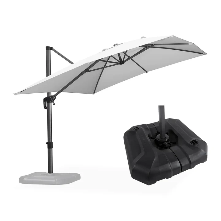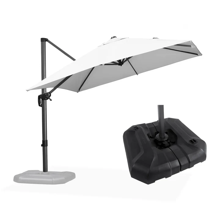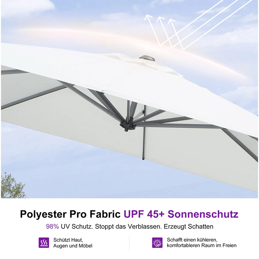 • Dieser freitragende Schirm verfügt über ein Kurbelsystem, mit dem sich die Kappe leicht auf- und abspannen lässt, ein einzigartiges Griffdesign, das ein einfaches Kippen des Schirms ermöglicht, und ein Fußpedal, das eine 360-Grad-Drehung erlaubt.