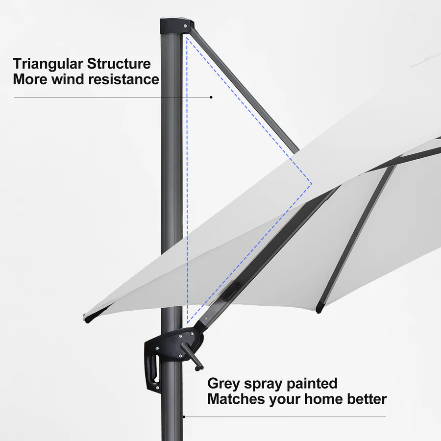 Der geneigte Aluminium-Ausleger verbindet den Mast und das Dach, um eine stabile dreieckige Struktur zu bilden, was den Schirm stabiler und windbeständiger macht.