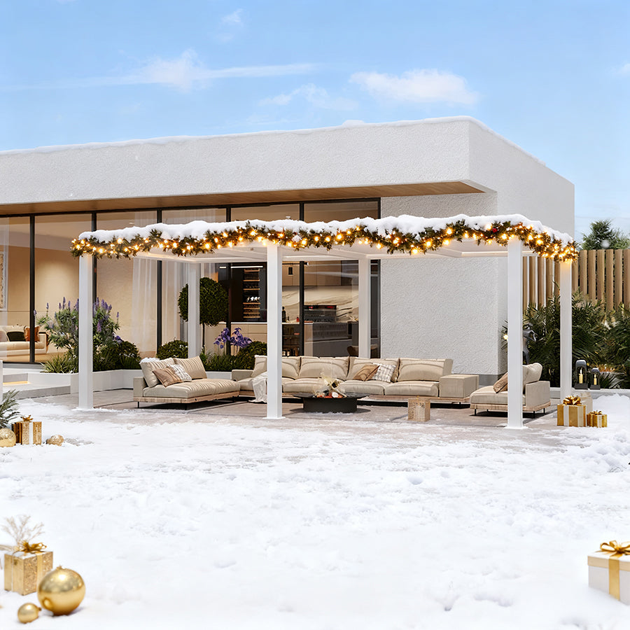 · Bei starkem Wind, Schneefall oder anderen extremen Witterungsbedingungen öffnen Sie bitte die Lamellen und heben Sie das installierte Sonnenschutzzubehör an oder entfernen es, um mögliche Schäden an Ihrer Pergola zu vermeiden.